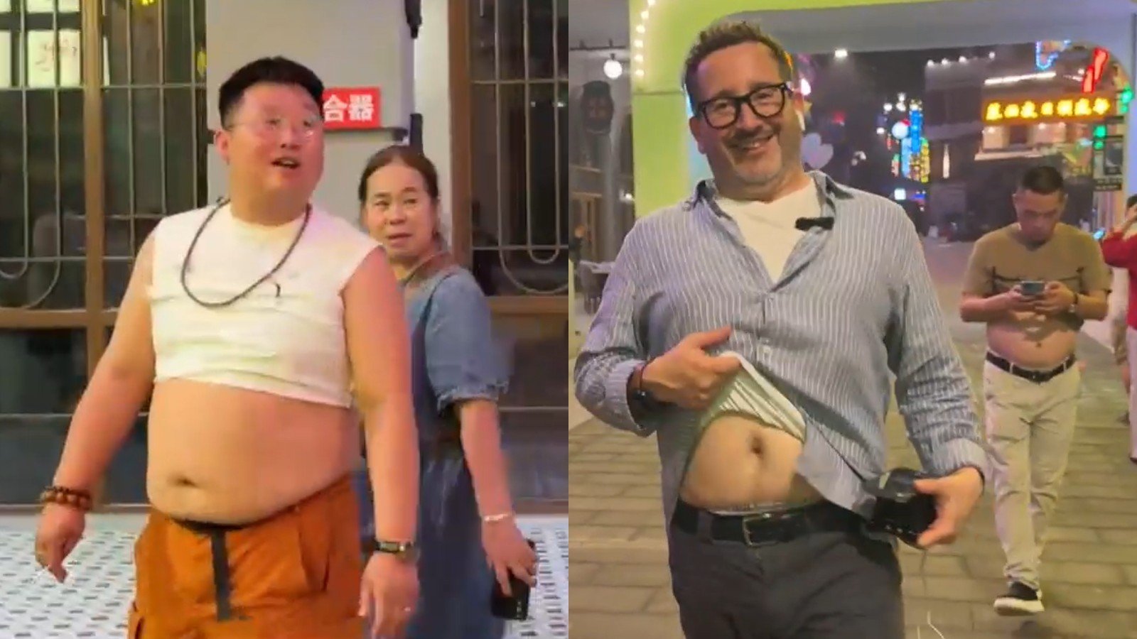 Mientras el animador recorría las calles del país asiático, Monserrat Álvarez y Simón Oliveros no pudieron evitar comentar el particular atuendo de un hombre que caminaba a su lado: vestía shorts y una polera levantada al estilo crop top, dejando su abdomen completamente al descubierto.