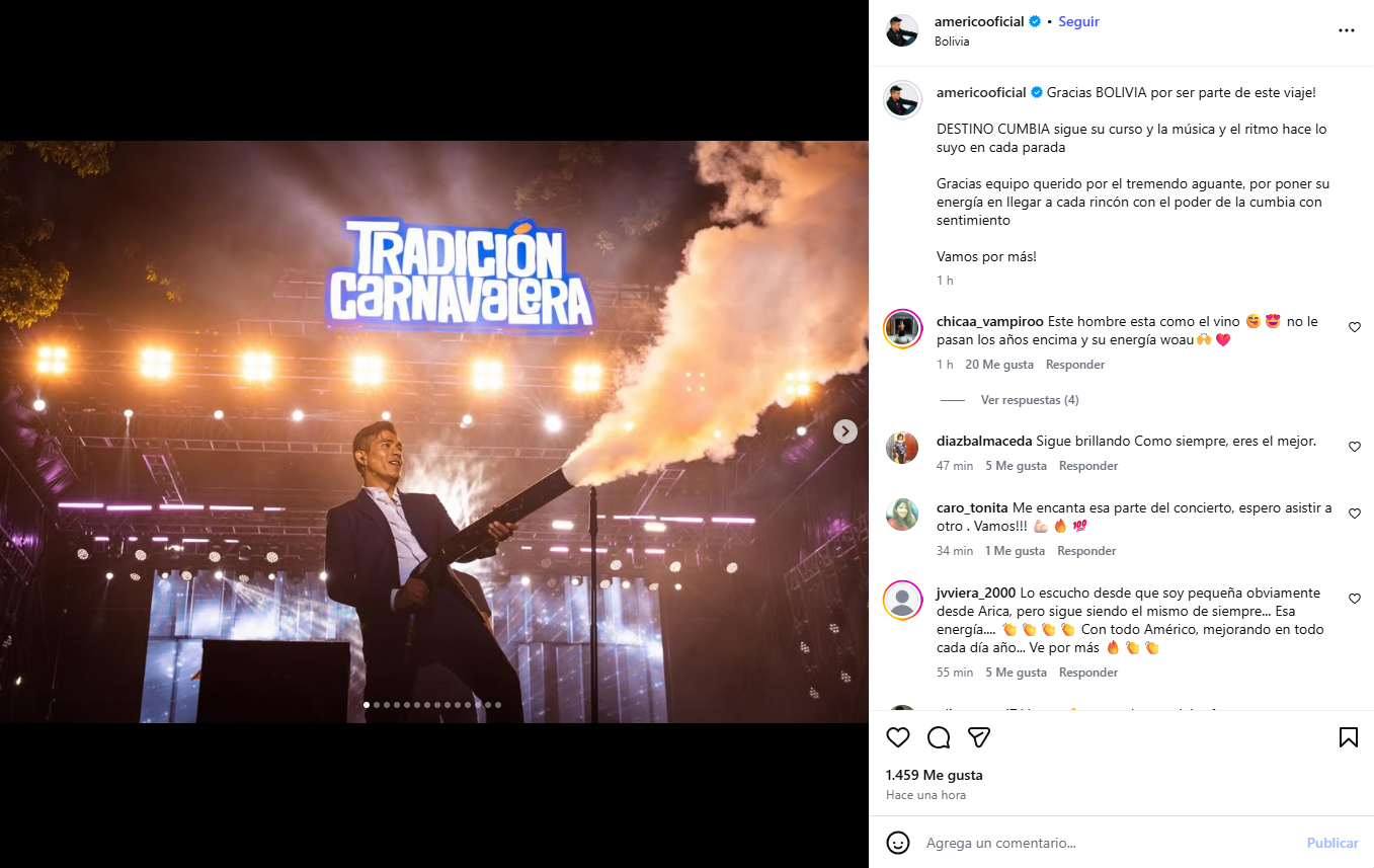 "Gracias equipo querido, por el tremendo aguante, por poner su energía en llegar a cada rincón con el poder de la cumbia con sentimiento", escribió en su Instragram Américo en el contexto de su viaje por Bolivia.