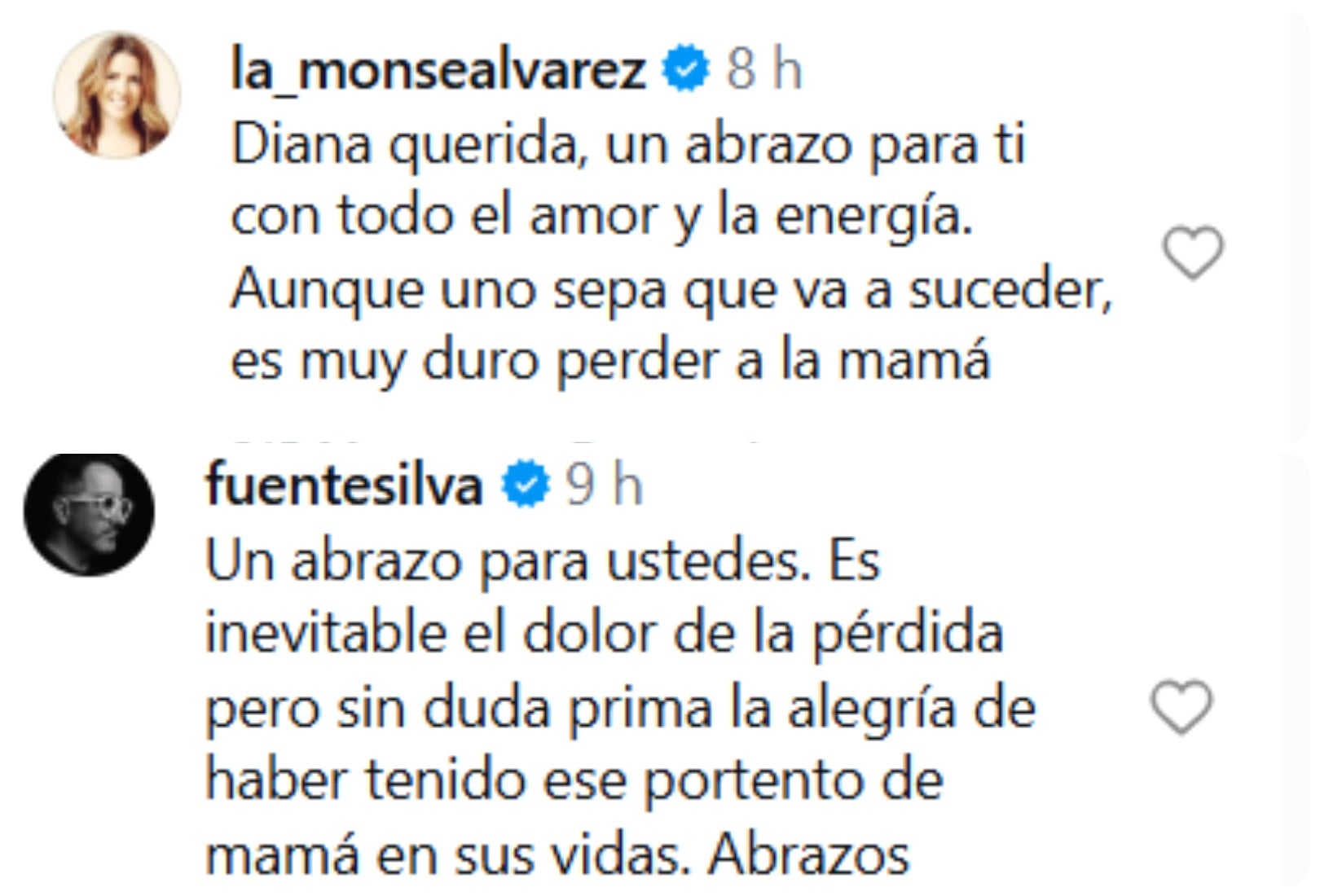 “Diana querida, un abrazo para ti con todo el amor y la energía. Aunque uno sepa que va a suceder es muy duro perder a la mamá”, señaló Alvarez.