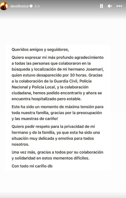 El cantante almeriense David Bisbal agradeció la colaboración tanto de las Fuerzas y Cuerpos de Seguridad del Estado como de los ciudadanos para localizar a su hermano José María Bisbal Ferre, que ha estado desaparecido durante "30 horas" y quien, tras ser localizado, ha ingresado en un centro hospitalario donde está "estable".