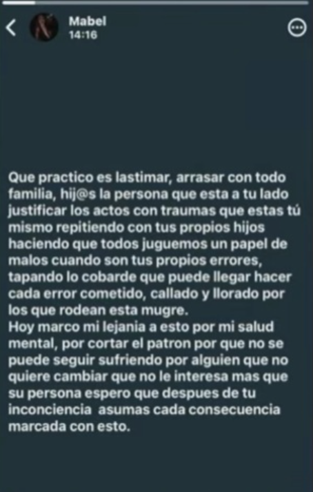 "Que práctico es lastimar, arrasar con todo, familia, hijos, la persona que está a tu lado, justificar los actos con traumas que estás repitiendo con tus propios hijos, haciendo que todos juguemos el papel de malos, cuando son tus propios errores, tapando lo cobarde que puede llegar a ser cada error cometido, callado y llorado por los que rodean esta mugre", expresó.