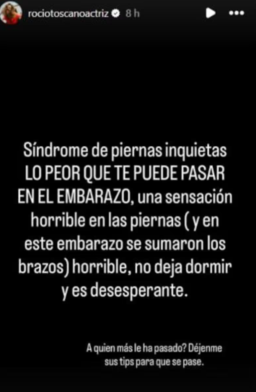 “Síndrome de las piernas inquietas, lo peor que te puede pasar en el embarazo. Una sensación horrible en las piernas (y en este embarazo se sumaron los brazos)”, expresó la actriz.