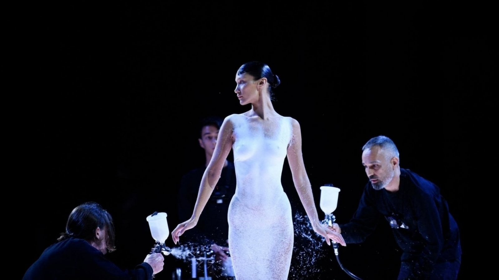 Hadid apareció sobre la pasarela vistiendo ropa interior de un color parecido a su tono de piel para que los diseñadores pudieran elaborar un vestido con un spray que rociaron sobre la modelo.