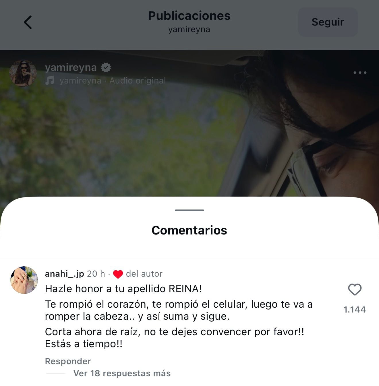 "Hazle honor a tu apellido, reina. Te rompió el corazón, te rompió el celular, luego te va a romper la cabeza... y así suma y sigue. Corta ahora de raíz, no te dejes convencer, por favor", escribió una usuaria.