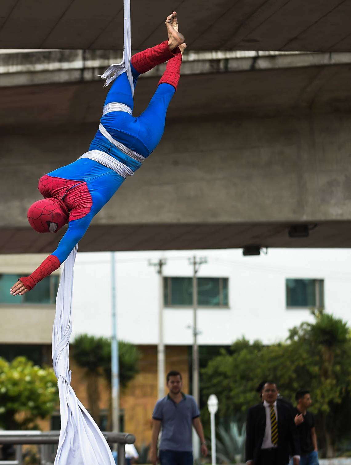 El sujeto vestido de rojo y azul no es Peter Parker, el fotógrafo detrás de la máscara del "Hombre Araña", sino Jahn Freddy Duque, un joven de 26 años nacido en Medellín que se gana la vida con espectáculos callejeros de danza aérea.
