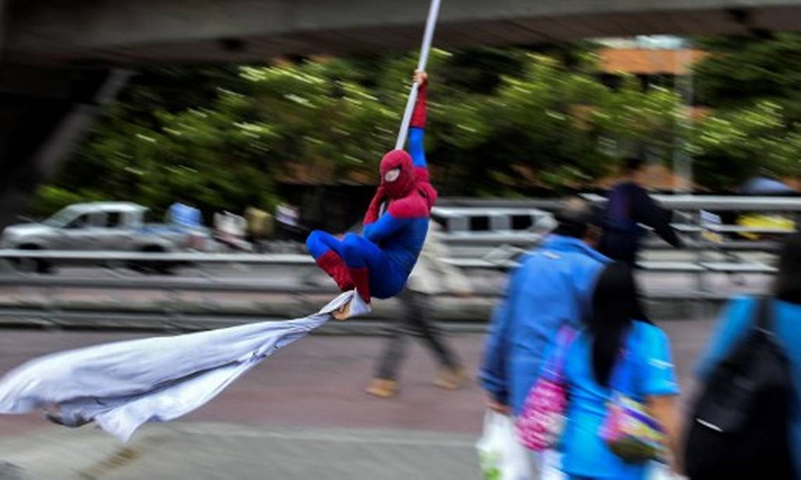 "Spiderman" abandonó Nueva York y ahora se pasea por el cielo de Bogotá, fijando la atención de los conductores que esperan el cambio del semáforo en una esquina del norte de la capital colombiana.