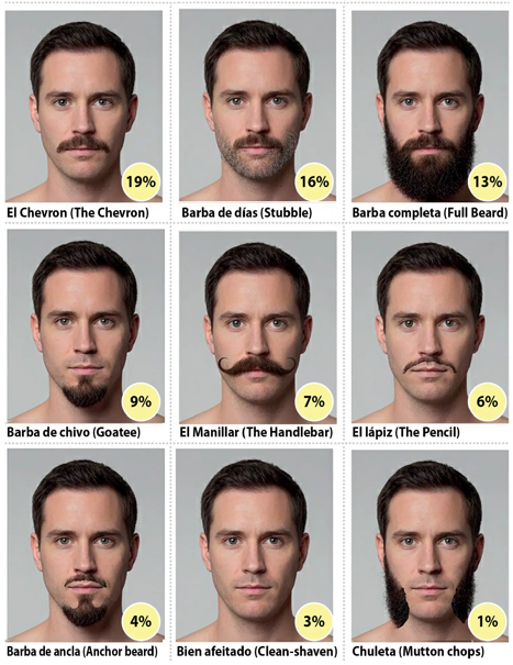 En segundo lugar se ubicó el 'Chevron' con un 19% de las preferencias, seguido del 'Stubble' con un 16%. El resto del listado lo componen la barba completa (13%), barba de chivo (9%), el 'Manillar' (7%), el 'Lápiz' (6%), la barba de ancla (4%), el afeitado total (3%) y las patillas chuleta (1%).