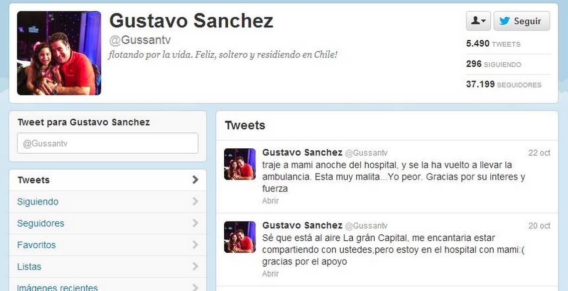 En su cuenta personal de Twitter (@Gussantv), Gustavo Sánchez había tuiteado el pasado 22 de octubre sobre el estado de salud de su madre.