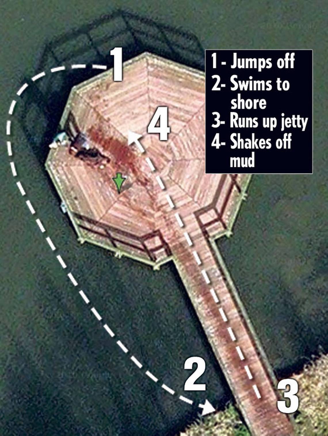 Otra de las teorías, es que en la toma satelital se pueden apreciar dos personas y que la escena descrita sería que habría un tercer ente, que se trataría de un perro que saltó desde el muelle y luego volvió nadando a tierra. Lo que sería una aparente "mancha de sangre", sería sólo el rastro del agua que destilaba desde el cuerpo del animal.