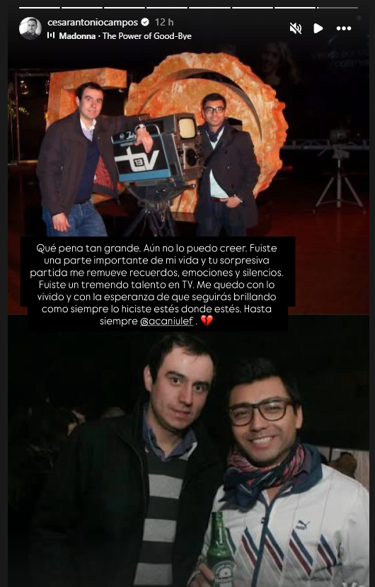"Qué pena tan grande. Aún no lo puedo creer. Fuiste una parte importante de mi vida, y tu sorpresiva partida me remueve recuerdos, emociones y silencios. Fuiste un tremendo talento en TV. Me quedo con lo vivido y con la esperanza de que seguirás brillando como siempre lo hiciste, estés donde estés. Hasta siempre Andrés Caniulef", escribió Campos en una historia en su cuenta de Instagram.