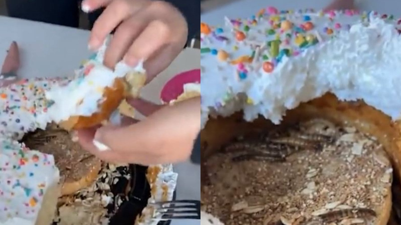 "Lo siento, me da mucha tristeza que por un minuto yo pensé que eran gusanitos del pastel, que se había echado a perder, pero esto no es de echado a perder, esto es a propósito", aseguró la influencer mientras mostraba el asqueroso 'regalo'.