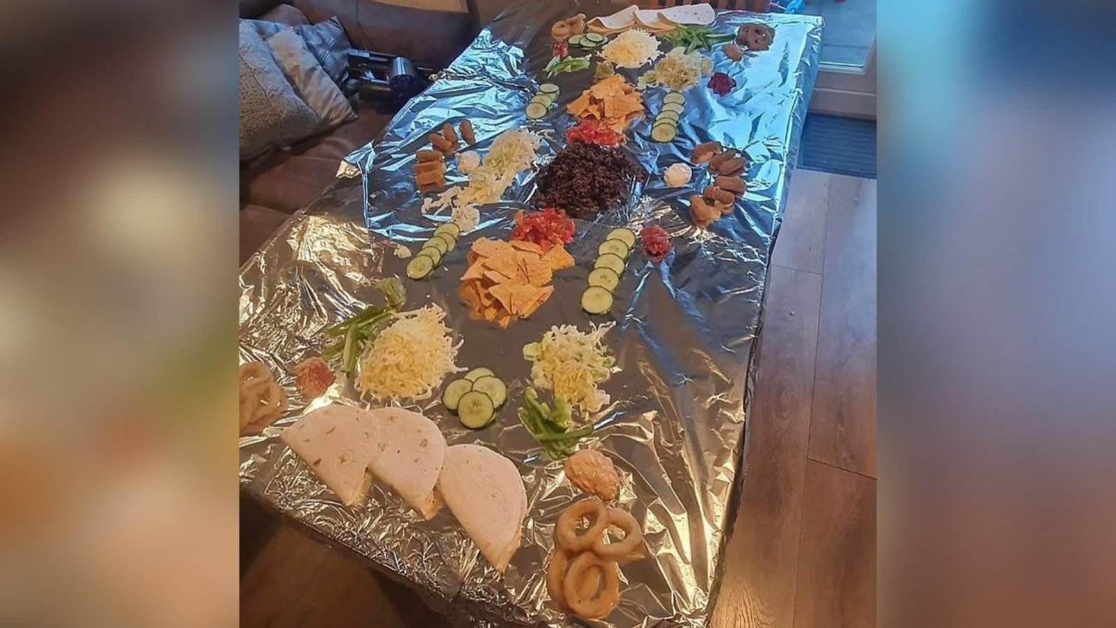 Rebecca colocó cinco tiras de papel de alumnio en la mesa del comedor para, posteriormente, apilar una serie de alimentos como carne picada, verduras, nachos y que así todos se sirvieran de forma independiente.