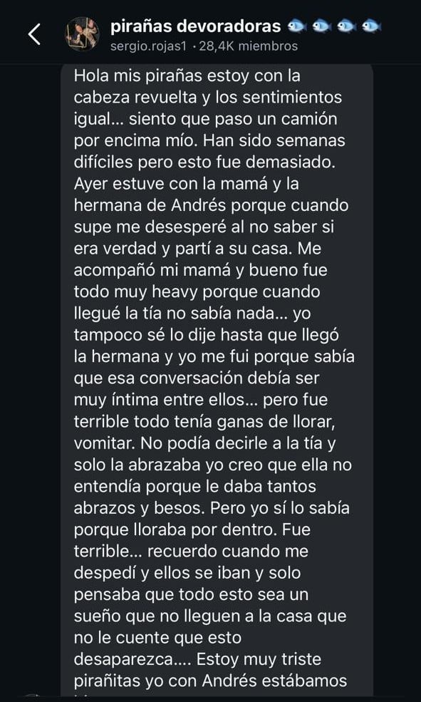 "Ayer (viernes) estuve con la mamá y la hermana de Andrés, porque cuando supe me desesperé al no saber si era verdad, y partí a su casa. Me acompañó mi mamá y bueno fue todo muy heavy porque cuando llegué la tía no sabía nada, yo tampoco se lo dije hasta que llegó la hermana y yo me fui porque sabía que esa conversación debía ser muy íntima entre ellos, pero fue terrible todo tenía ganas de llorar, vomitar. No podía decirle a la tía y solo la abrazaba yo creo que ella no entendía porque le daba tantos abrazos y besos", inició relatando el periodista.