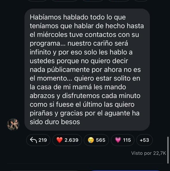 "Habíamos hablado todo lo que teníamos que hablar de hecho hasta el miércoles tuve contactos con su programa, nuestro cariño será infinito y por eso solo les hablo a ustedes porque no quiero decir nada públicamente por ahora no es el momento, quiero estar solito en la casa de mi mamá les mando abrazos y disfrutemos cada minuto como si fuese el último las quiero pirañas y gracias por el aguante ha sido duro", culminó Rojas en una publicación en su canal de difusión.