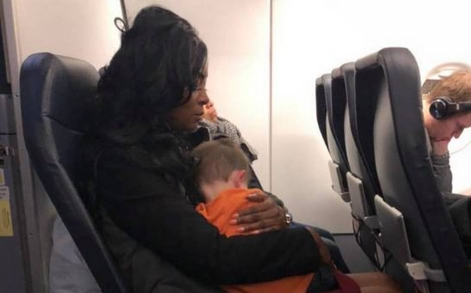 Al ver la desesperación de la madre una mujer se le acercó y le dijo "parece que necesitas un descanso". Luego tomó al niño para llevárselo a su asiento.