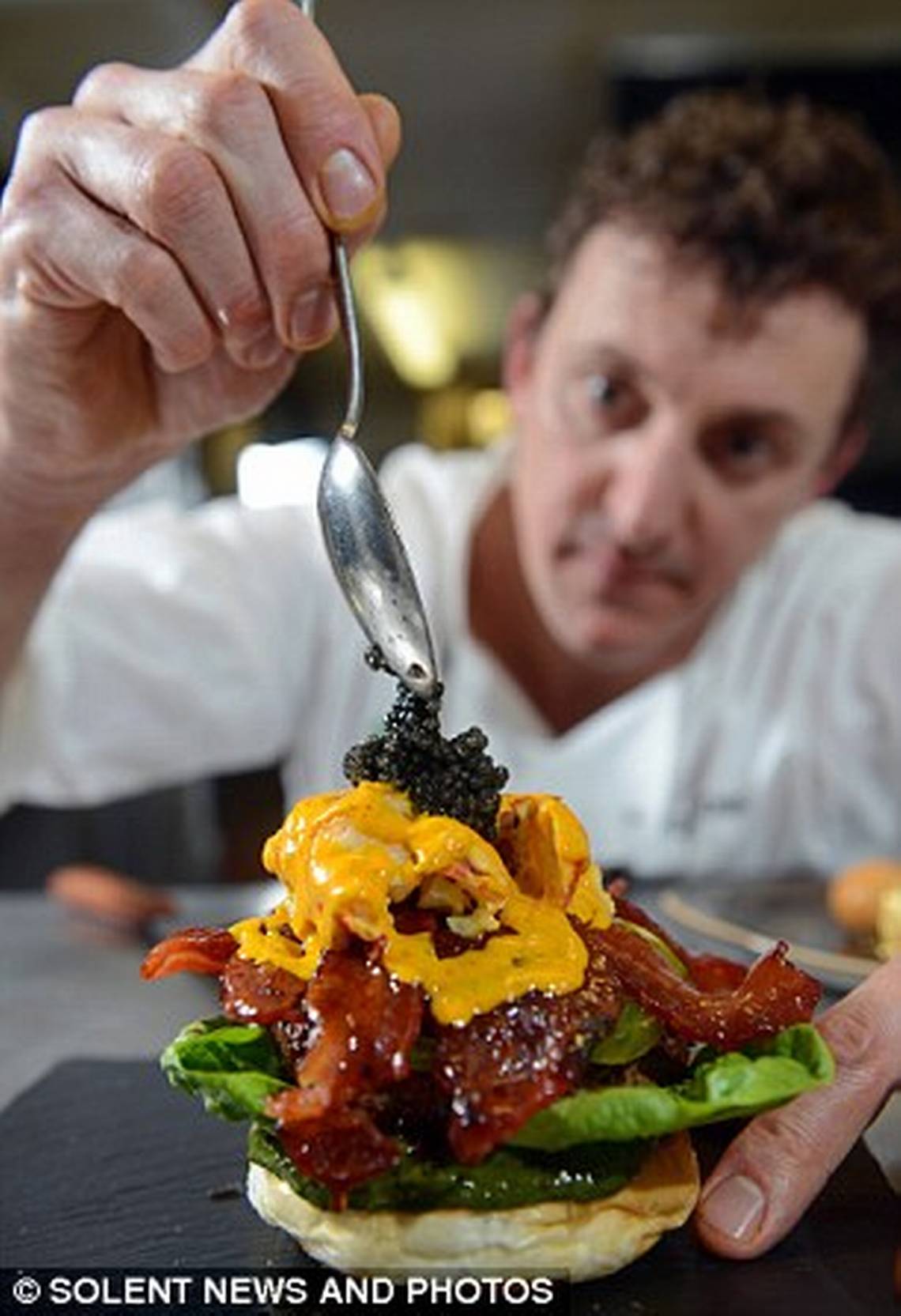 Esta hamburguesa de 1.000 dólares contiene carne de vaca de Wagyu y de Kobe, cubierta con carne de venado, langosta, caviar, trufa negra y un huevo de pato. También está "adornada" con hoja de oro comestible.