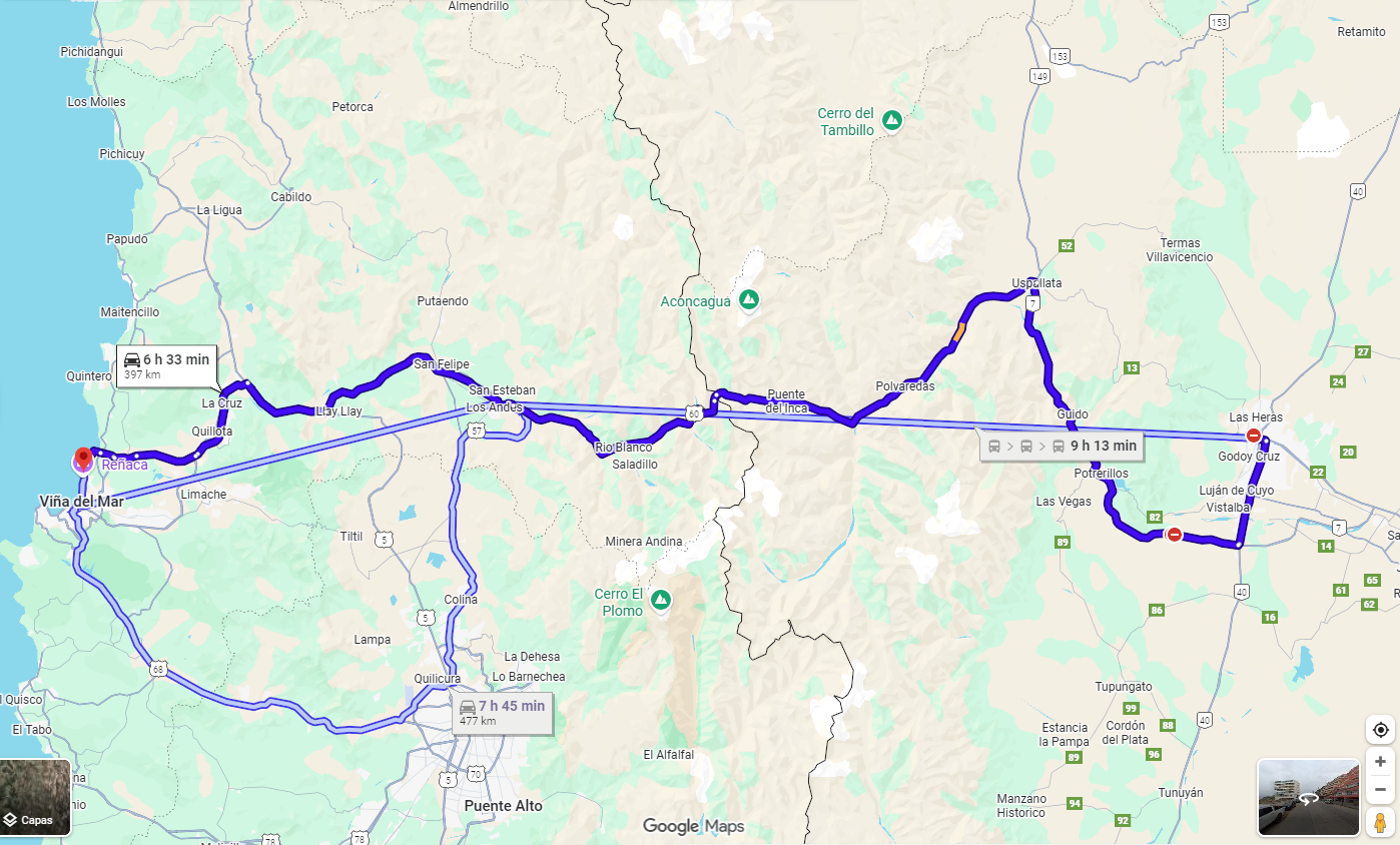 Si se habla del viaje de Mendoza a Reñaca, es mucho más corto, ya que la distancia es de 398 kilómetros por lo que el gasto en bencina destacan, no sería superior a los 60 mil pesos.
