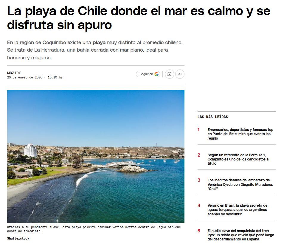 Tras la alta afluencia de ciudadanos trasandinos, el medio MDZ de Mendoza, Argentina, destacó una playa de la región de Coquimbo.