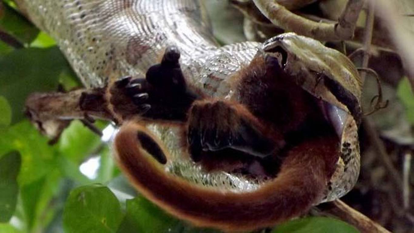 Las imágenes fueron tomadas en la Amazonía brasileña. Elproceso duró 76 minutos, tiempo en el que la serpiente gigante engulle alsimio, incapaz de escapar del "abrazo mortal" del ofidio.