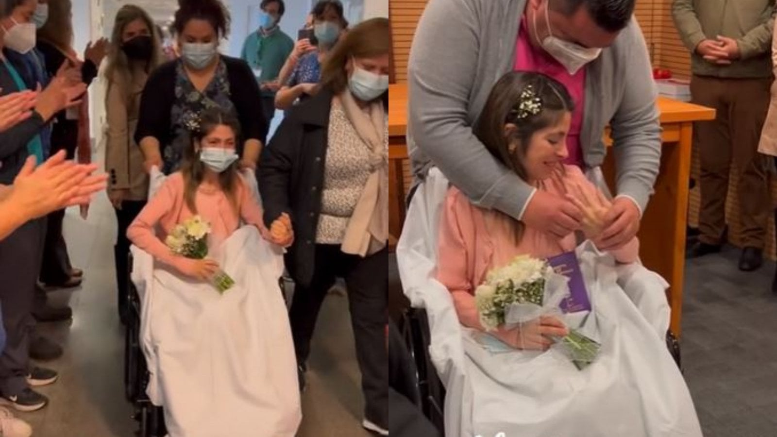 En el video se ve cómo la mujer es maquillada y peinada en una cama hospitalaria y, posteriormente, es llevada en silla de ruedas hacia el lugar donde contrajo matrimonio, todo entre aplausos de los funcionarios del recinto médico.