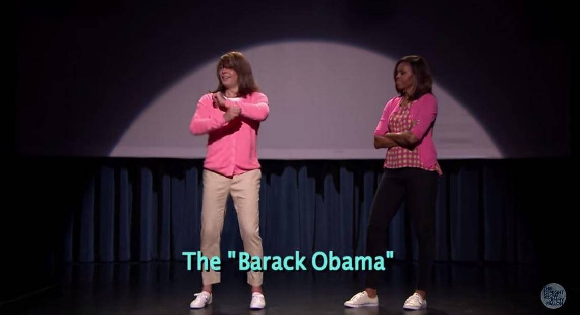 Durante el segmento en 'The Tonight Show', las dos figuras de EE.UU. presentaron 'La evolución del baile de las mamás 2', el cual incluye pasos como "The Shimmy Twist", "The knock knock" y el "Barack Obama", que al parecer no le causó mucha gracia a la esposa del presidente norteamericano.