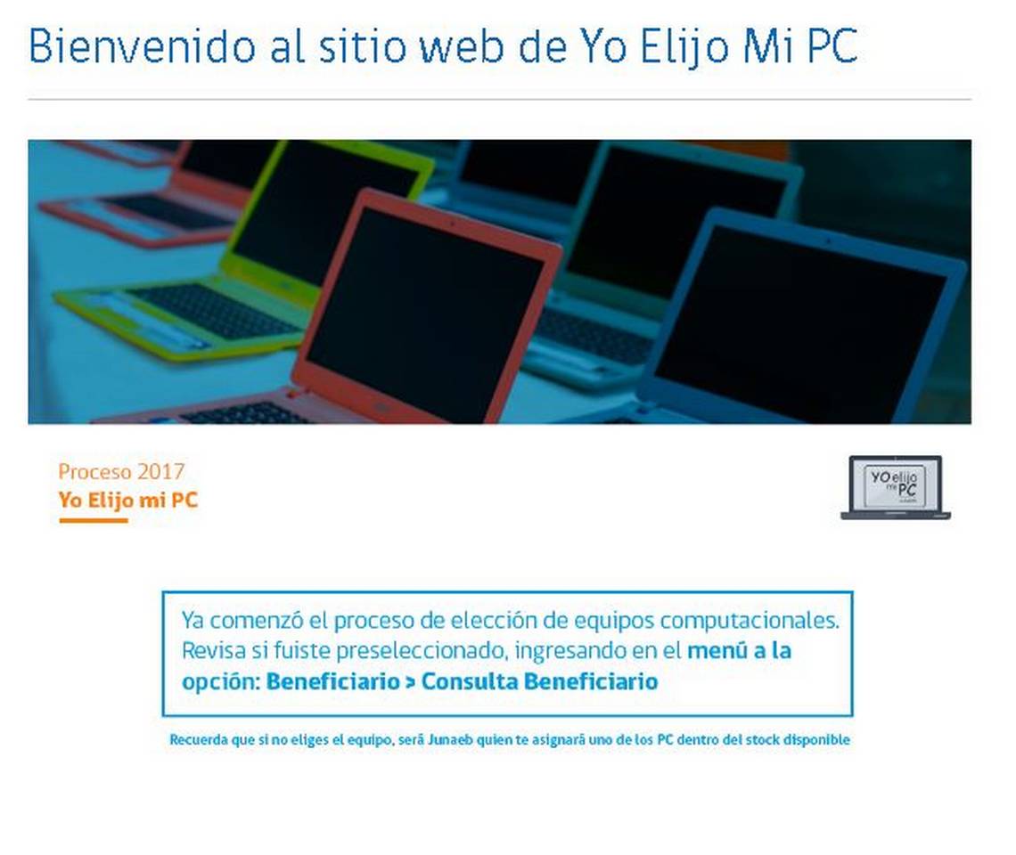 La Junta Nacional de Auxilio Escolar y Becas (Junaeb) informó que hasta el domingo 11 de diciembre los estudiantes beneficiados con los programas "Yo elijo mi PC" y "Me conecto para aprender" podrán elegir los equipos que son entregados gratuitamente por la institución.