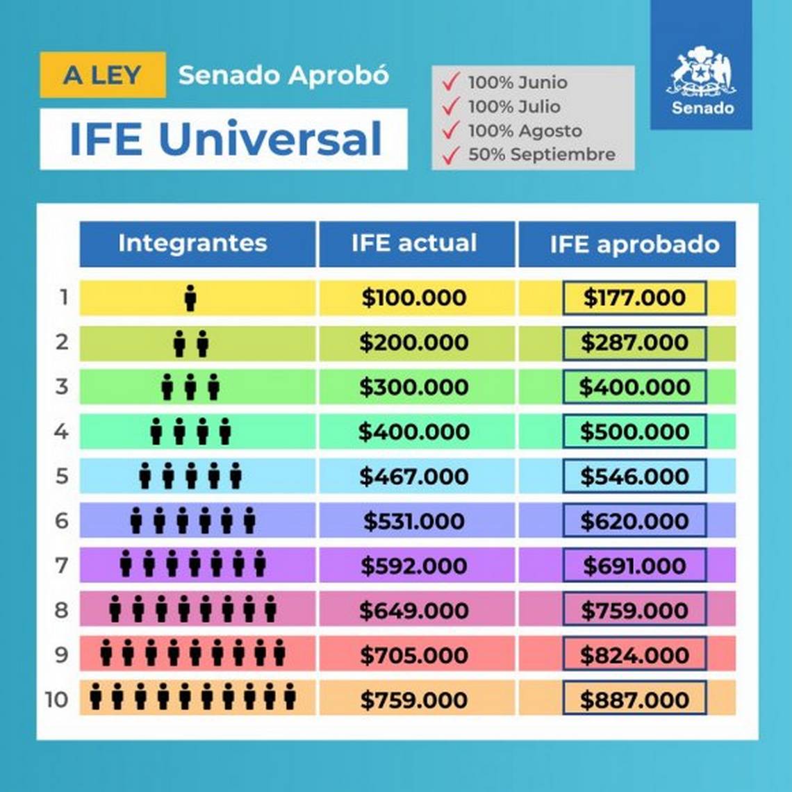 El aporte aumentará de 100 mil pesos por persona que otorga el IFE actual a 177 mil, cifra que va subiendo paulatinamente según la cantidad de personas que componen el grupo familar. De esta manera, una familia de cuatro integrantes que recibía 400 mil pesos con el IFE, con el IFE Universal pasará a percibir 500 mil pesos. Revisa aquí el aporte según la cantidad de personas en el hogar: